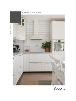 Vit köksinredning (2018), delvis med luckor med glasinfattning, beslag i mässing och vitt kakel ovan ljus, marmorerad arbetsbänk i laminat. Köket är utrustat med integrerad kyl/frys, vägghängd ugn, keramisk spishäll, fläkt, integrerad diskmaskin och diskho. Parkettgolv och ljusa väggar.