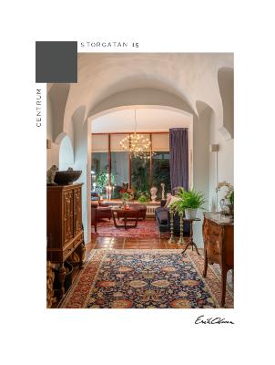 Stengolv och vita väggar samt höga fönsterpartier. Utgång till uteplatsen i väster.