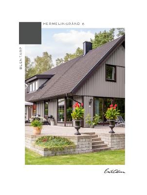 Stenlagd uteplats som sträcker sig runt huset. Här finns det både plats för utemöbler, platsbyggd grill och andra sociala ytor.